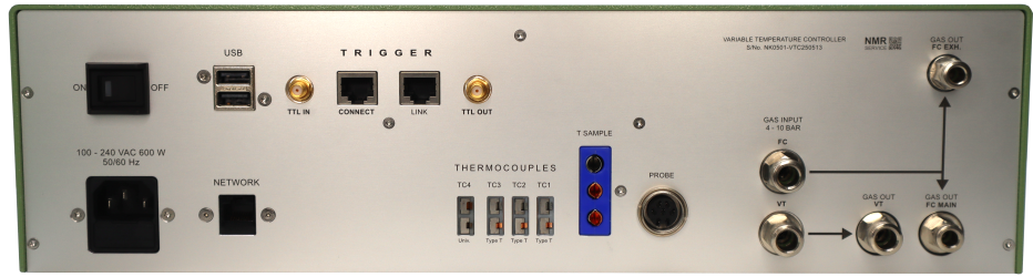 - Temperature control with external flow control (typical for MAS NMR experiments) (interlock required)